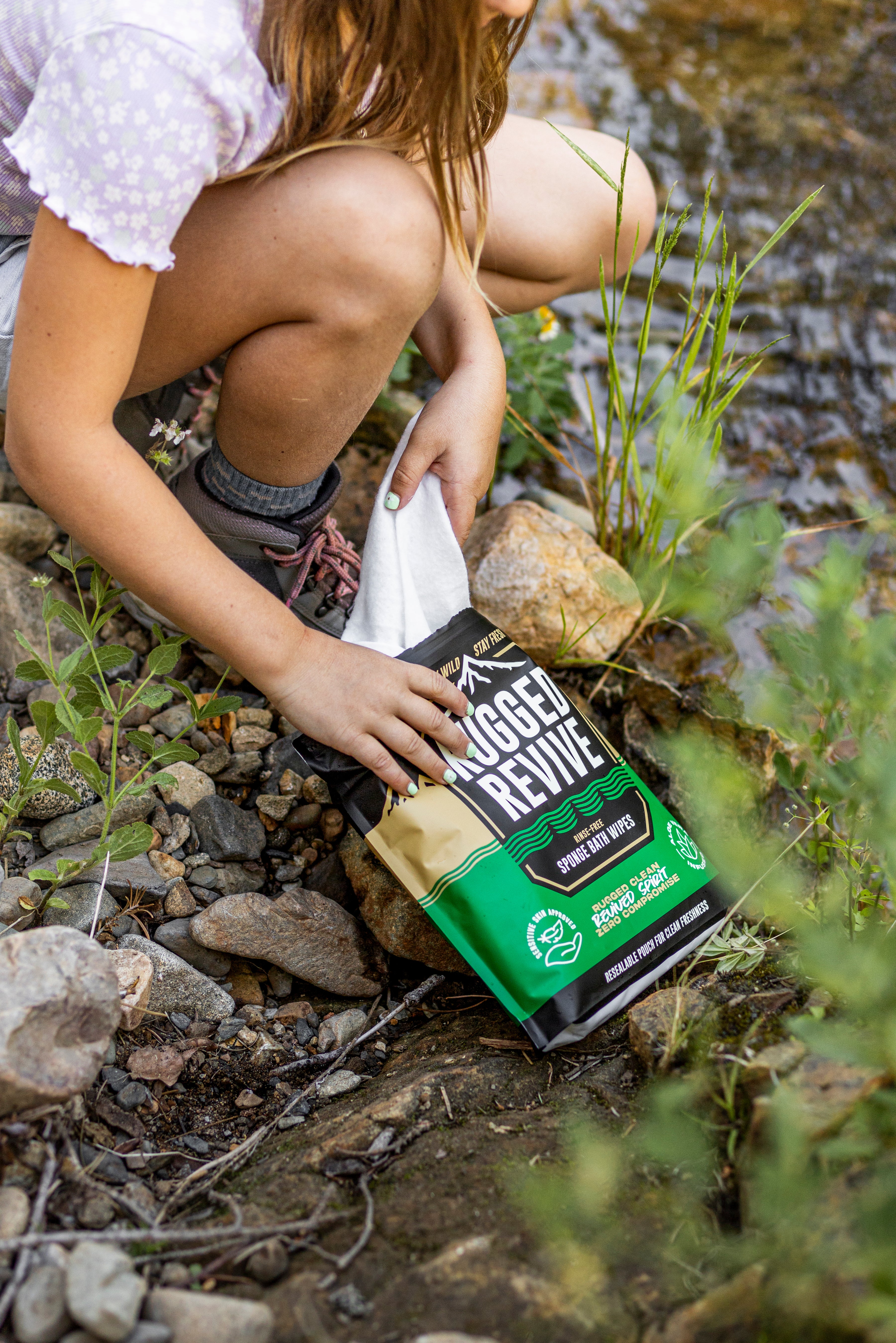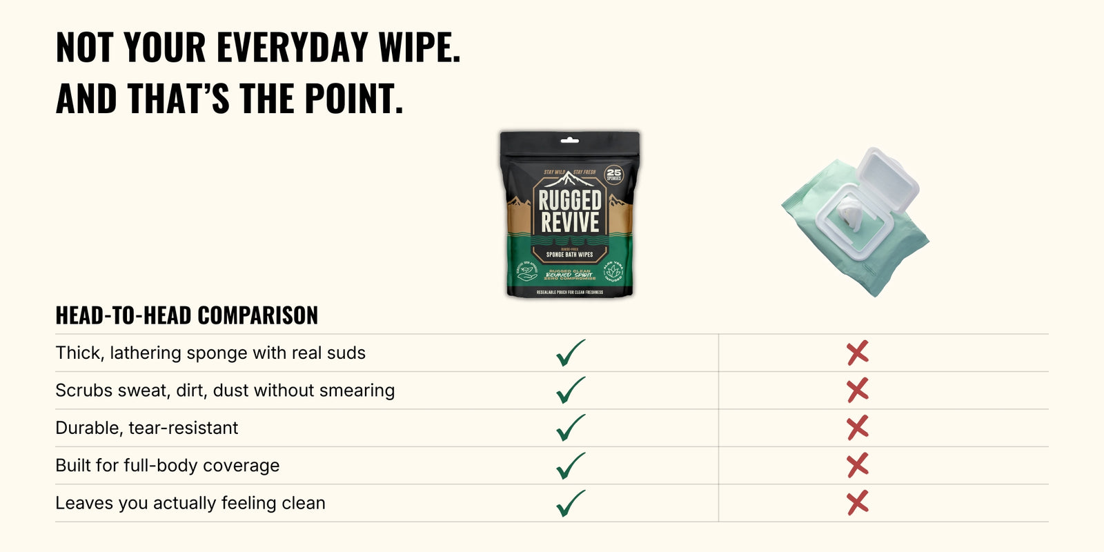 Rugged Revive gives you a real clean wherever the trail takes you. Our thick, lathering sponge wipes scrub away sweat, grime, and camp dust without tearing or smearing. No water. No shortcuts. Just a shower-like clean anywhere you need it.